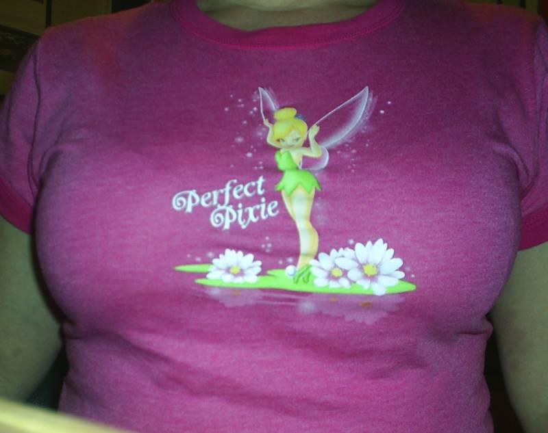 I was on vacation and saw this shirt and just had to have it. I am not so confident wearing it since it says "perfect" on it by any means, but thought it's too cute to pass up. Of course my mother in law looked at me funny. Maybe this picture needs to be under "You know you're addicted to pixies when....."