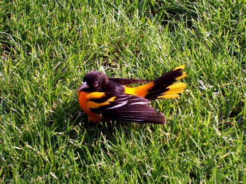 That discovery was early Sunday morning. Later that day, as we worked in the yard, I heard something hit something over by my truck. Turned around to see the antenna on my truck bobbing. Mr. Lixy asked me what happened and I assumed a bird hit it. He went to look and sure enough there was a Baltimore Oriole in the grass. What a beautiful bird! It was stunned but didn't seem badly hurt. It flew away about 20 minutes later. Whew!